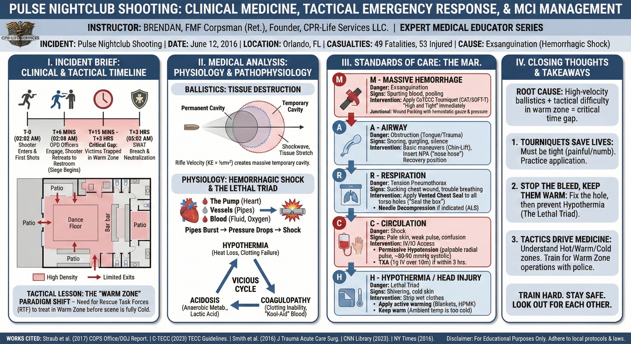 The Pulse Nightclub shooting highlighted a brutal reality: in a mass shooting, time is the enemy. The gap between the injury and the intervention is where lives are saved or lost. The root cause of the high death toll was a combination of high-velocity ballistics and the tactical difficulty of reaching patients in a "barricaded" warm zone.