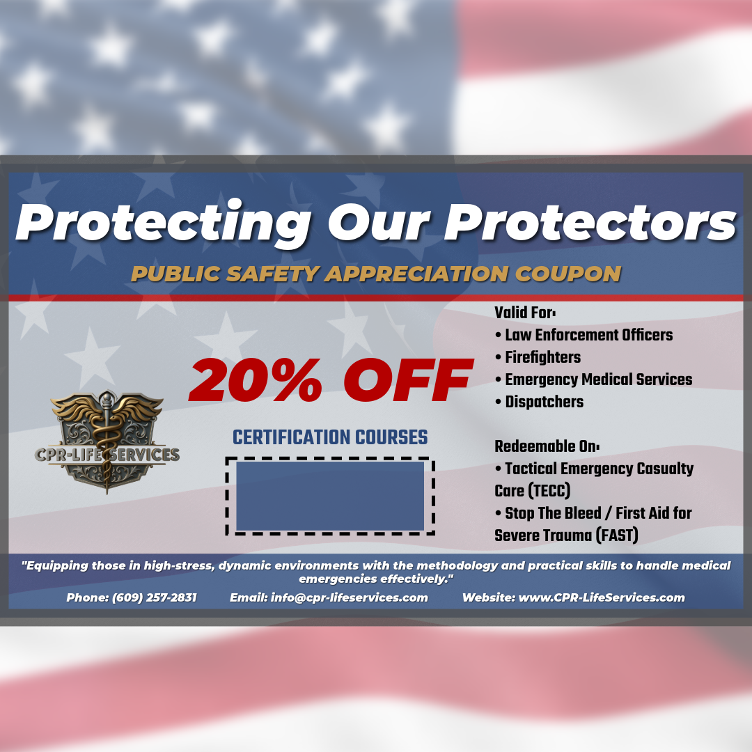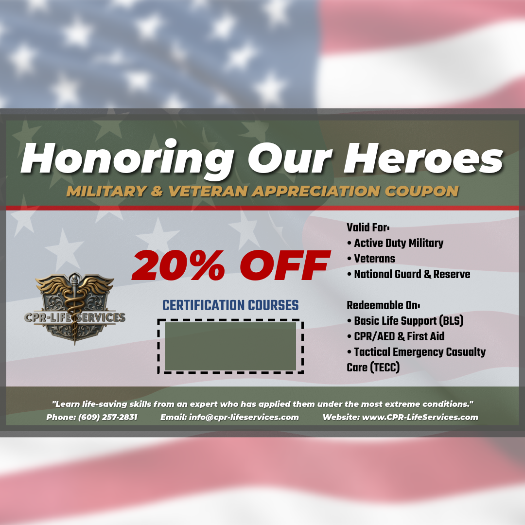 Military/Veteran Coupon: Basic Life Support (BLS), CPR/AED & First Aid, and Tactical Emergency Casualty Care (TECC).