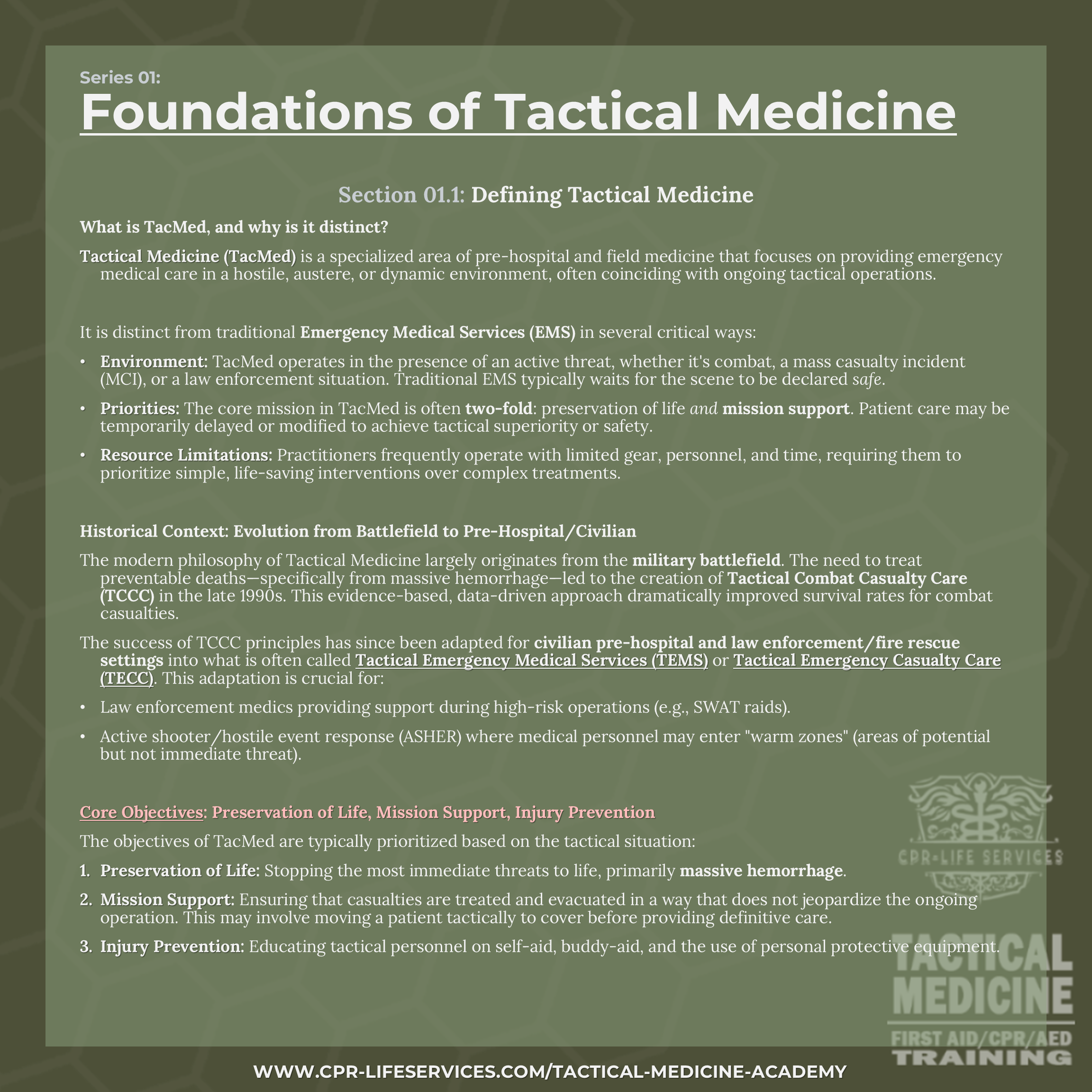 Environment: TacMed operates in the presence of an active threat, whether it's combat, a mass casualty incident (MCI), or a law enforcement situation. Traditional EMS typically waits for the scene to be declared safe.