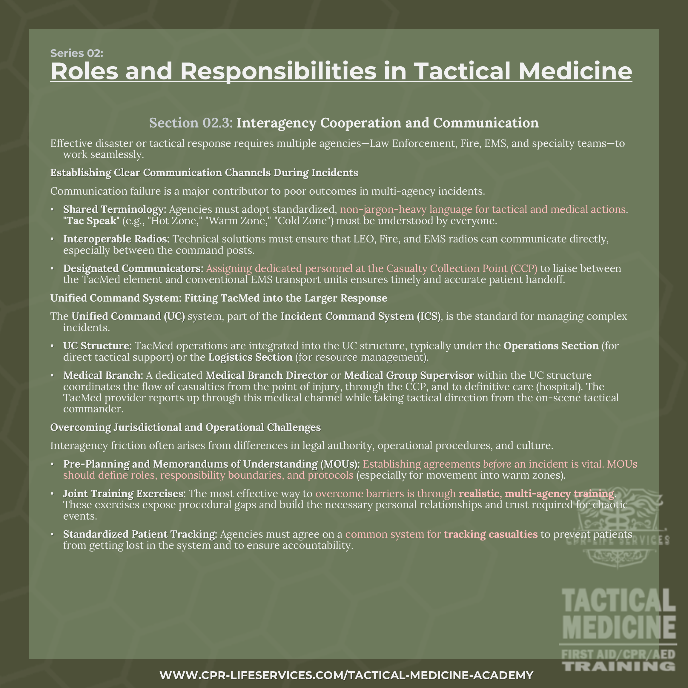 Designated Communicators: Assigning dedicated personnel at the Casualty Collection Point (CCP) to liaise between the TacMed element and conventional EMS transport units ensures timely and accurate patient handoff.